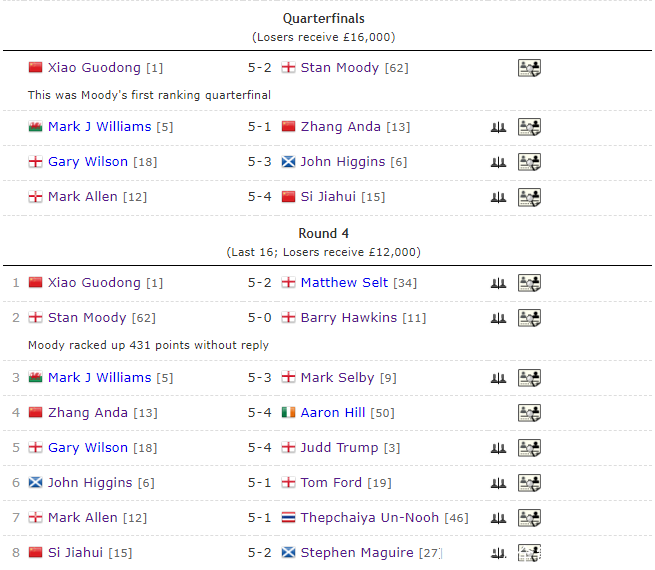 第八局,莫得退路的张安达张开绝地反击,他打出单杆63分,88-7支持赛点,比分追成4-4,两边参预决胜局。决胜局,总比分以83-14锁定胜局,连扳两局之后,总比分5-4逆转晋级。连得1/4决赛,张安达挑战“金左手”马克-威廉姆斯未果,1-5无缘四强。斯佳辉至极缺憾地以4-5输给“小钢炮”马克-艾伦。肖国栋则是无间强势前进,他以5-2轻取黑马斯坦-穆迪。