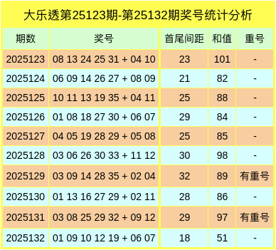 和值分析:上期前区奖号和值为51,较上期数据下跌46点,开出小和值。最近10期前区奖号数据浮现小和值较热,本期预测和值开在76-86区间和值。