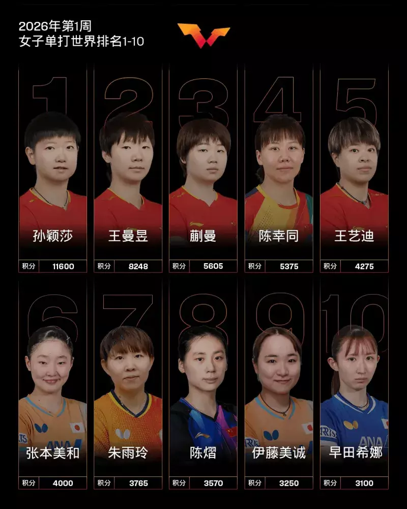 国外乒联公布2026年第1周天下排行,王楚钦、孙颖莎赓续排行男女单打天下第一。