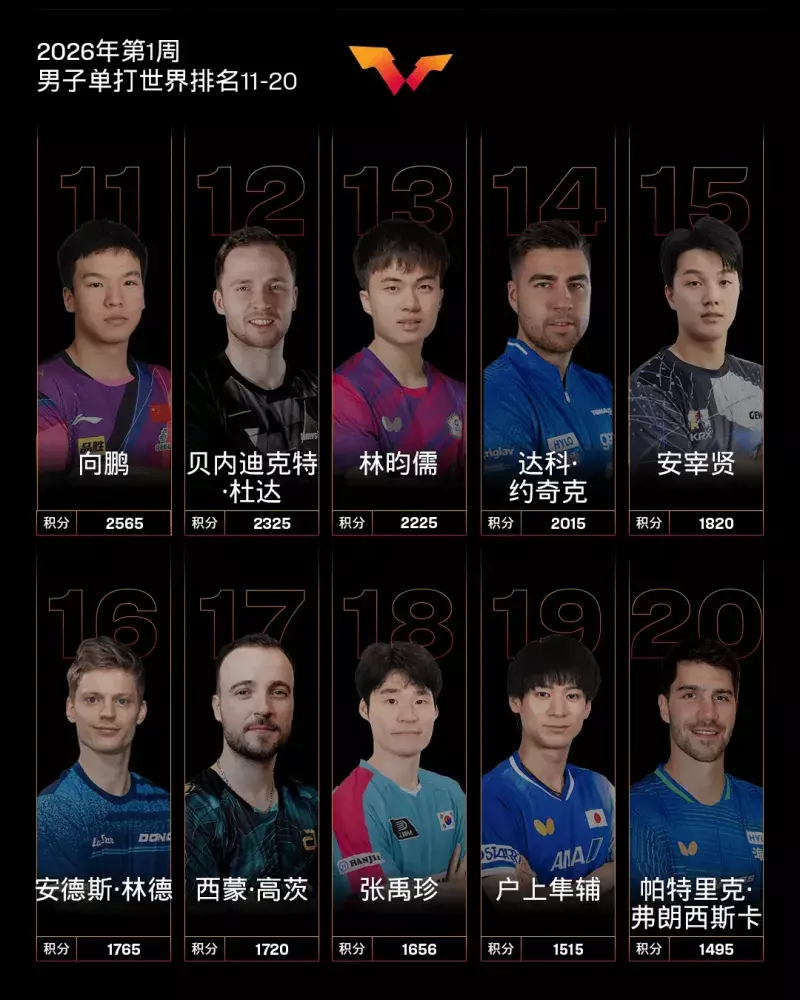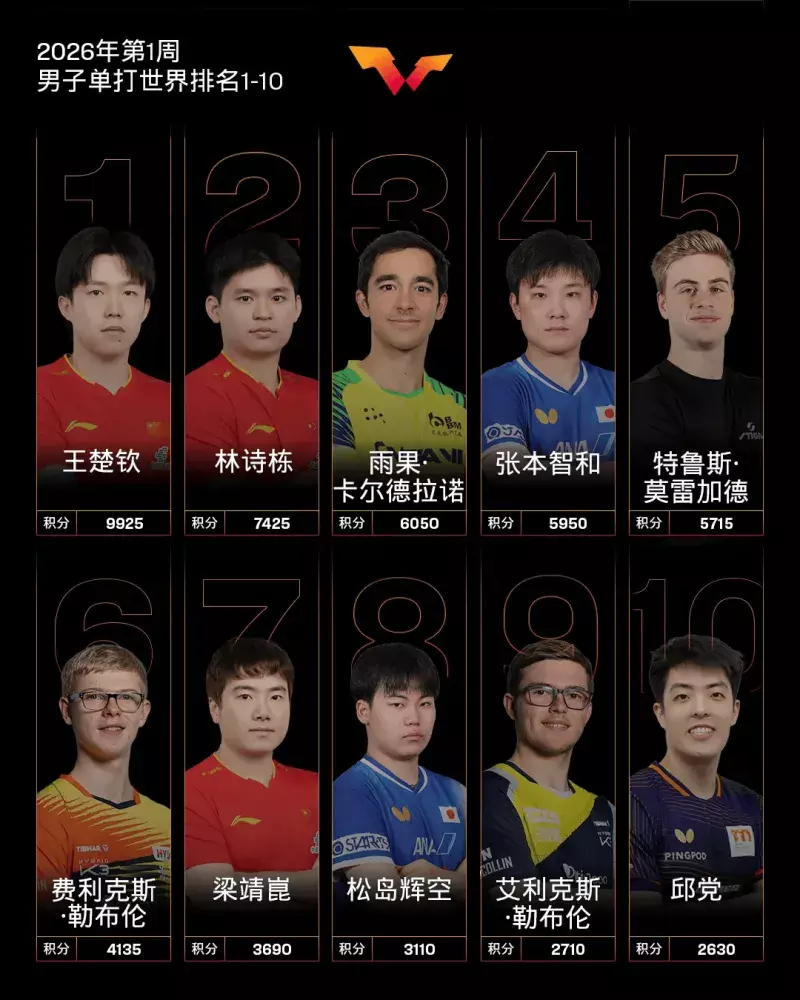 男片面王楚钦、林诗栋前二,雨果-卡尔德拉诺第三,梁靖崑第七。其他中国队球员,向鹏排行第11,陈垣宇排行第23,周启豪排行第40,陈俊菘排行第44,黄友政排行第48。其中,陈俊菘刷新了个东说念主奇迹糊口排行新高;