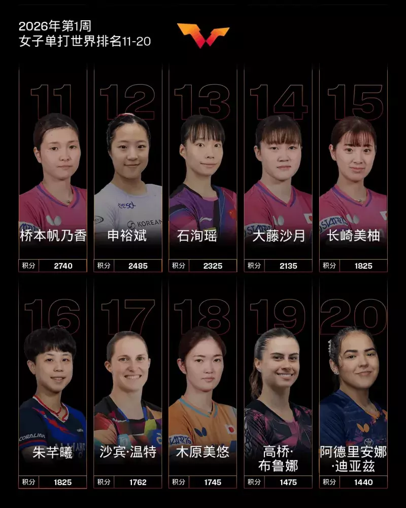 女片面,中国队球员孙颖莎、王曼昱、蒯曼、陈幸同、王艺迪位列前五,陈熠位列第八。其他中国队球员,石洵瑶排行第13,何卓佳排行第30,覃予萱排行第34,钱天一转名第38。